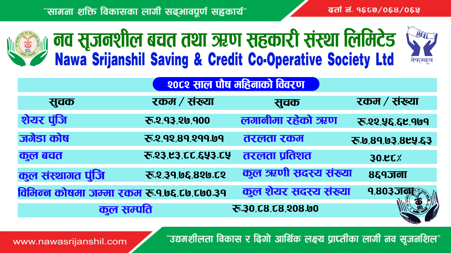 The contribution made by our shareholders in achieving the goal of the organization's Vision 2088 is commendable and incomparable. We, the staff family, are grateful for their trust and intimacy. We are always committed and ready to provide quality and effective service to the people and fulfill the dream of the people within the policies made by the Board of Directors.