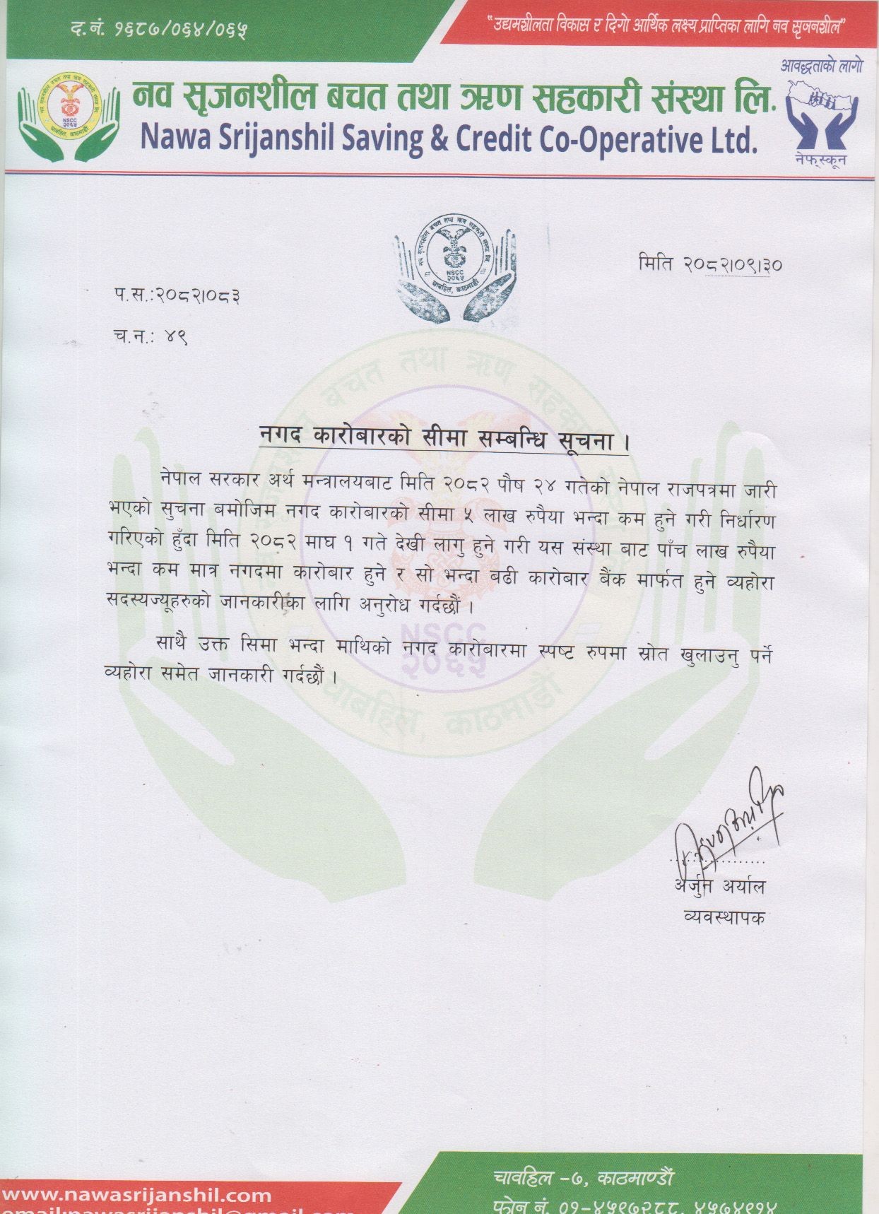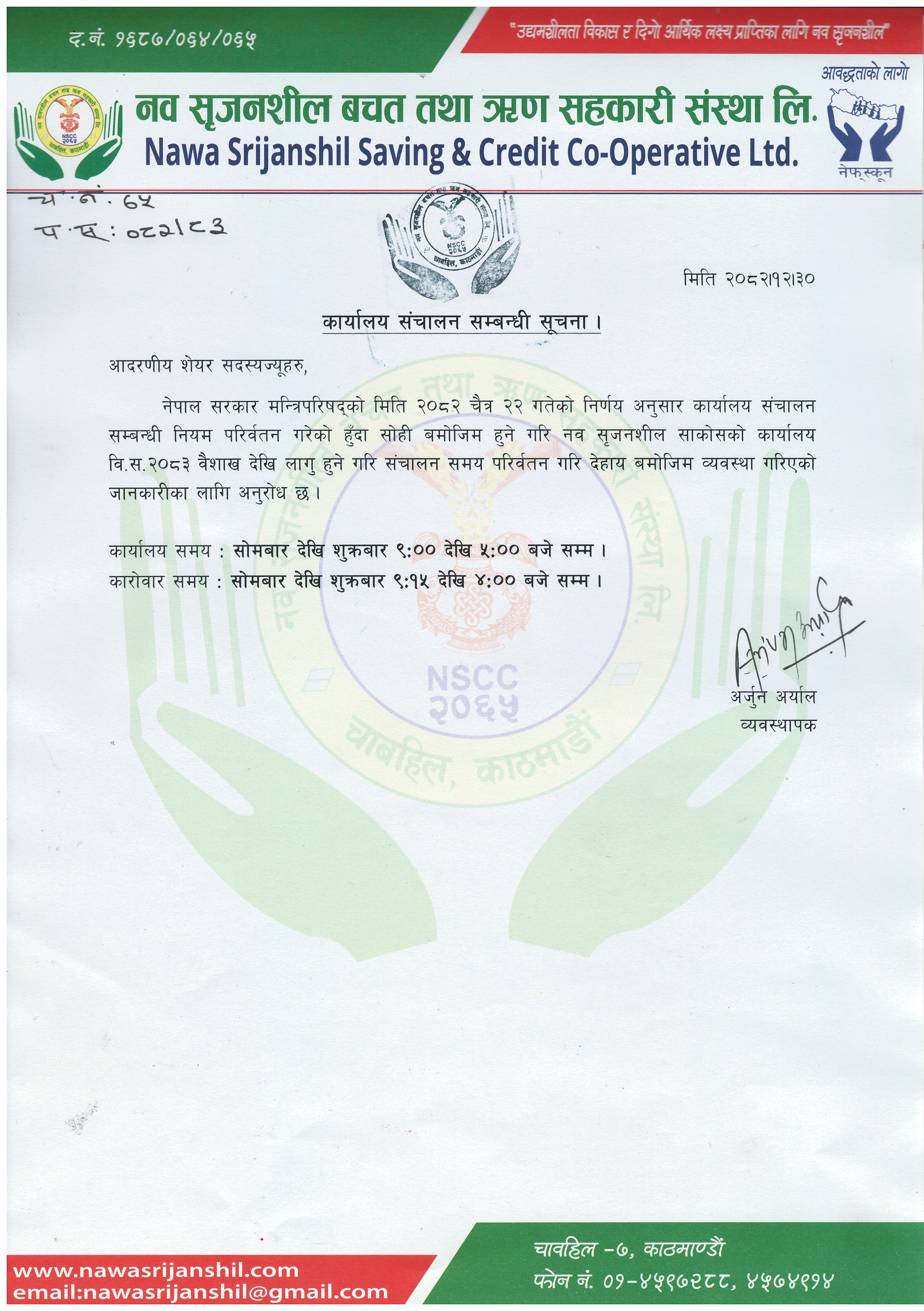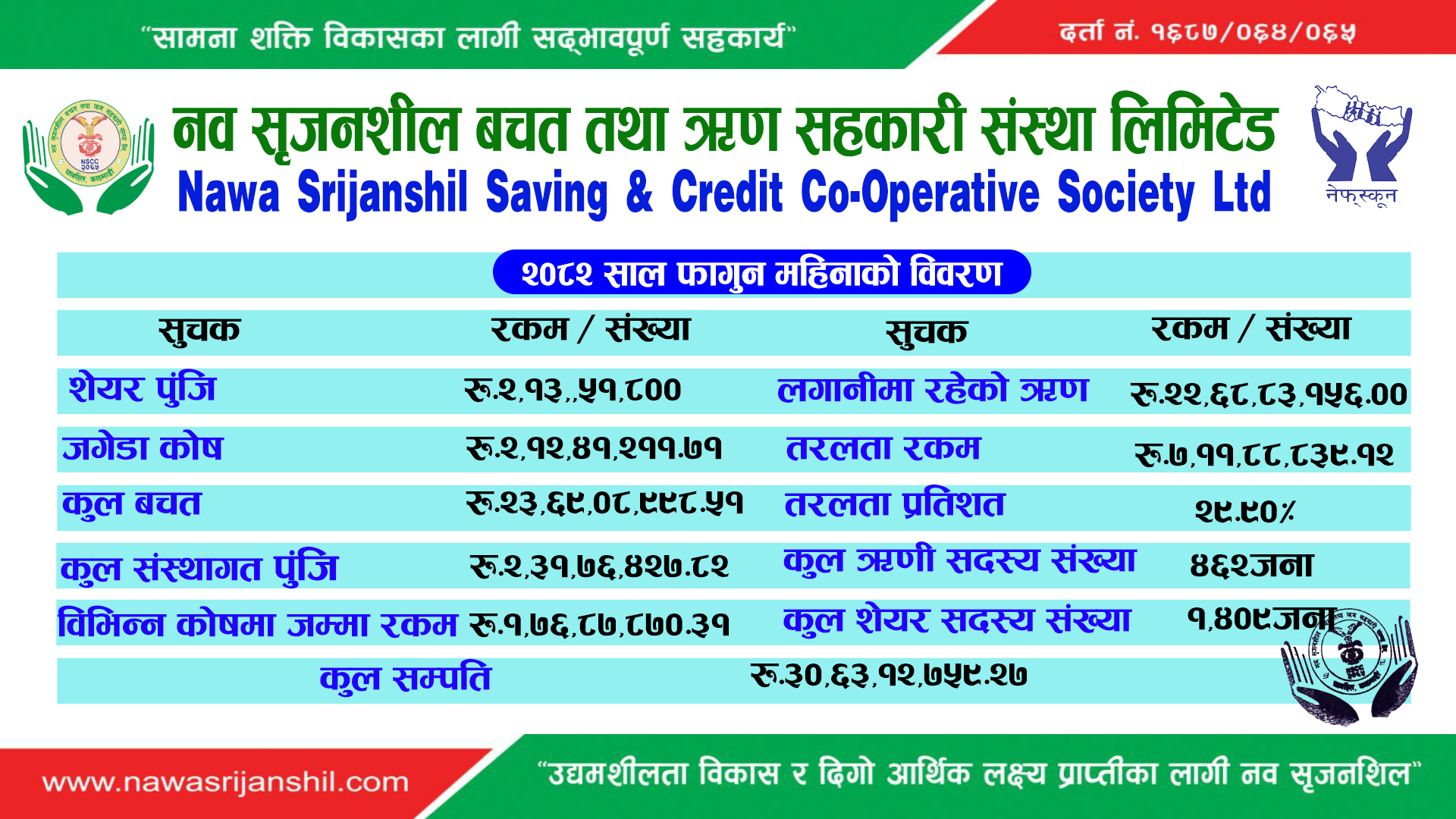 The office of this Nawa Srijanshil Savings and Credit Co-operative Society Ltd., established in accordance with the Government of Nepal Co-operatives Act, 2048 BS on 4 th Asaar 2065 BS, is located at Ka.Ma.Pa-7, Chabahil . Before Srijanshil Savings Fund has been established with the objective of solving small financial problems by mobilizing small savings from around 24 creative young entrepreneurs from since 28th Bhadra, 2057 BS. Registered Current Nawa Srijanshil Savings and Credit Co-operative Society Ltd. The organization, which came into operation with a small capital...